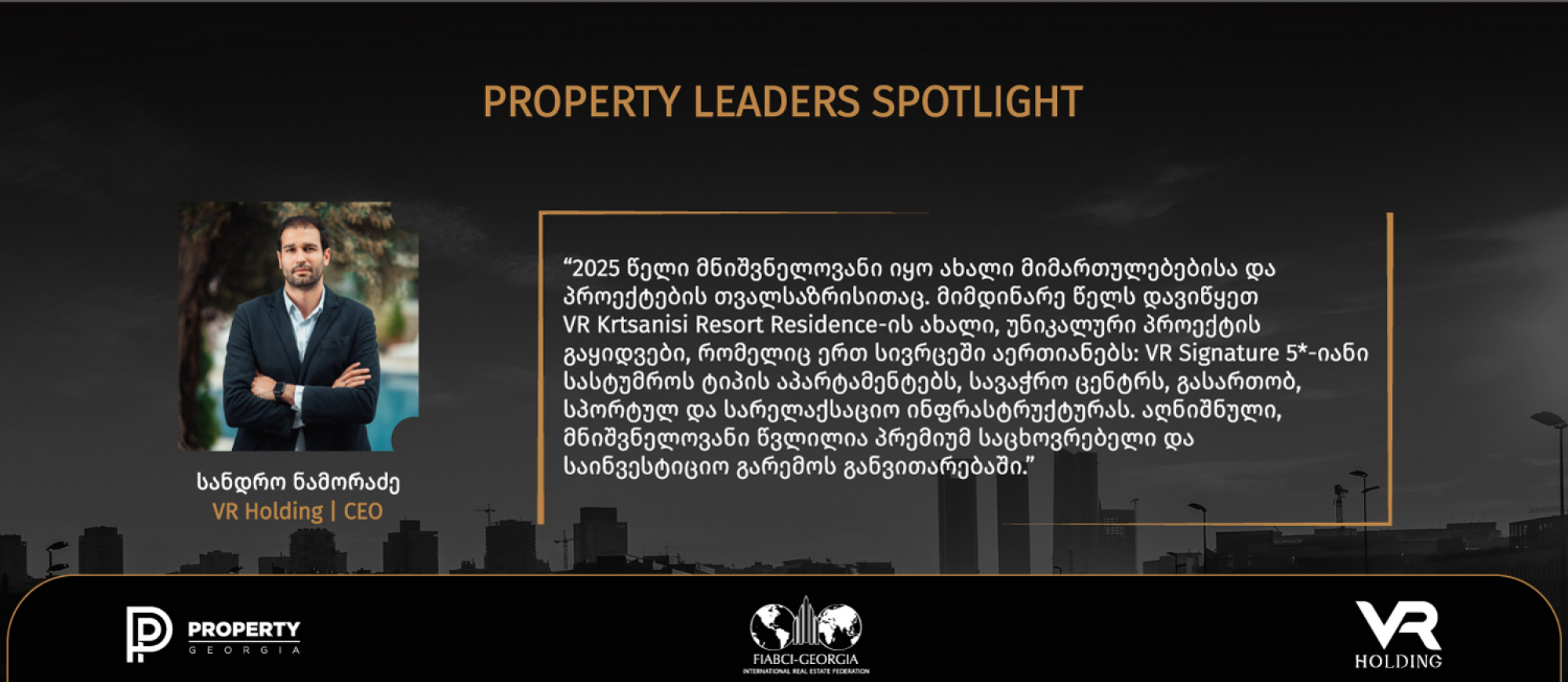 2025 წელი მნიშვნელოვანი იყო ახალი მიმართულებებისა და პროექტების თვალსაზრისითაც. მიმდინარე წელს დავიწყეთ VR Krtsanisi Resort Residence-ის ახალი, უნიკალური პროექტის გაყიდვები, რომელიც ერთ სივრცეში აერთიანებს: VR Signature 5*-იანი სასტუმროს ტიპის აპარტამენტებს, სავაჭრო ცენტრს, გასართობ, სპორტულ და სარელაქსაციო ინფრასტრუქტურას. აღნიშნული, მნიშვნელოვანი წვლილია პრემიუმ საცხოვრებელი და საინვესტიციო გარემოს განვითარებაში.