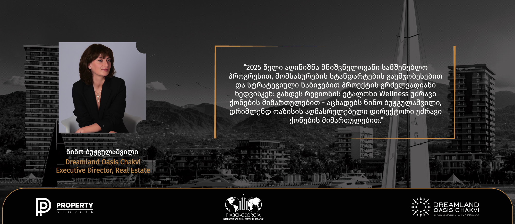 2025 წელი აღინიშნა მნიშვნელოვანი სამშენებლო პროგრესით, მომსახურების სტანდარტების გაუმჯობესებით და სტრატეგიული ნაბიჯებით პროექტის გრძელვადიანი ხედვისკენ: გახდეს რეგიონის ეტალონი Wellness უძრავი ქონების მიმართულებით - აცხადებს ნინო ბუჟგულაშვილი, დრიმლენდ ოაზისის აღმასრულებელი დირექტორი უძრავი ქონების მიმართულებით.
